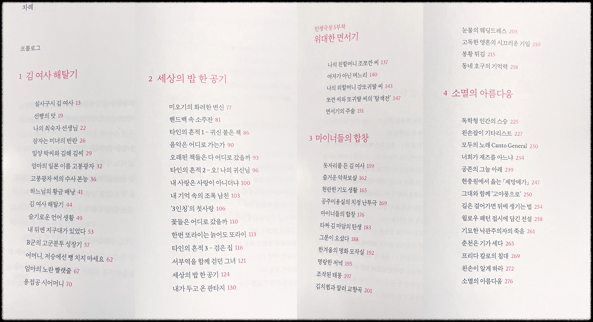 60여 편의 글을 읽으면서 작가님이 어떤 삶을 살아왔는지 조금이나마 느낄 수 있었다. 그리고 '걸크러시'느낌이 난다는 생각은 나만 느끼는 걸까?^^; 다른 작품들을 찾아서 읽어봐야겠다.
