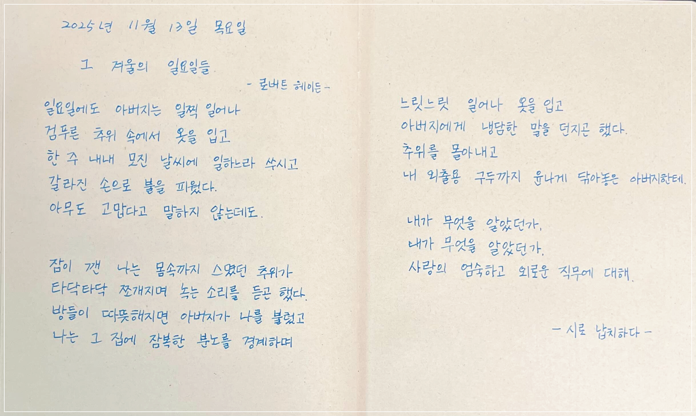 '로버트 헤이든'의 시 '그 겨울의 일요일들'입니다.