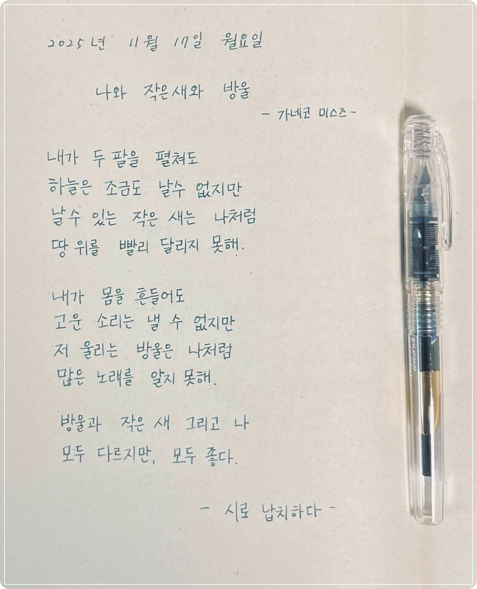| 오늘의필사 : 동사 '부딪치다'(요시노 히로시) (31) | 2025.11.16 |